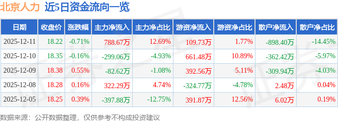 证券之星消息,截至2025年12月11日收盘,北京人力(600861)报收于18.22元,下跌0.71%,换手率0.93%,成交量3.41万手,成交额6216.6万元。
