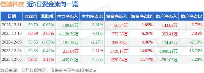 证券之星消息,截至2025年12月11日收盘,佳驰科技(688708)报收于59.7元,下跌0.65%,换手率0.61%,成交量8685.0手,成交额5217.74万元。