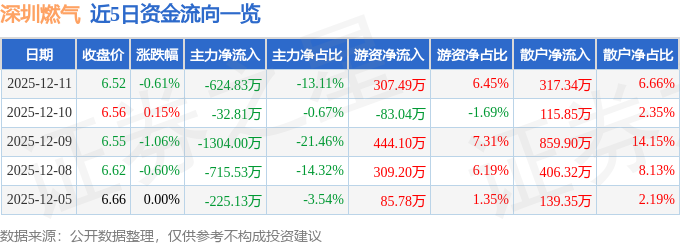 证券之星消息,截至2025年12月11日收盘,深圳燃气(601139)报收于6.52元,下跌0.61%,换手率0.25%,成交量7.29万手,成交额4767.05万元。
