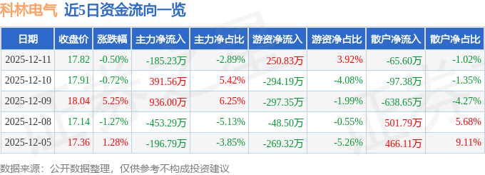 证券之星消息,截至2025年12月11日收盘,科林电气(603050)报收于17.82元,下跌0.5%,换手率0.88%,成交量3.57万手,成交额6406.66万元。