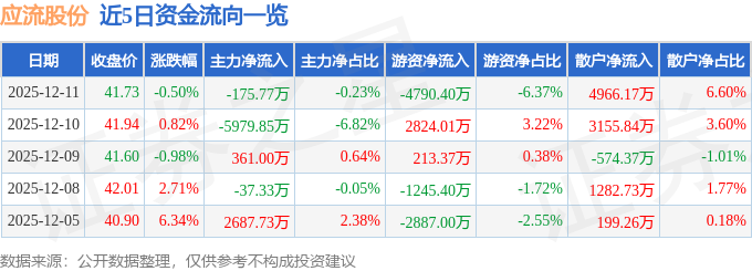 证券之星消息,截至2025年12月11日收盘,应流股份(603308)报收于41.73元,下跌0.5%,换手率2.61%,成交量17.73万手,成交额7.52亿元。
