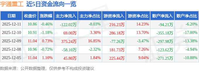 12月11日的资金流向数据方面,主力资金净流出122.02万元,占总成交额8.03%,游资资金净流入216.23万元,占总成交额14.23%,散户资金净流出94.21万元,占总成交额6.2%。