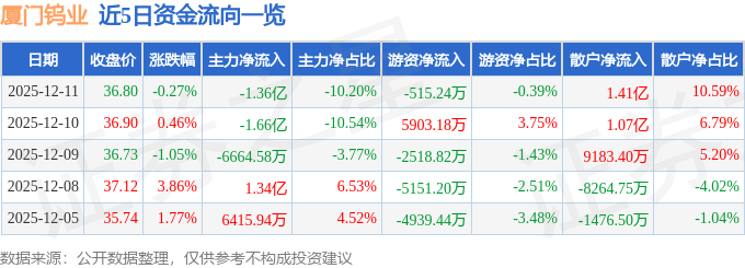 证券之星消息,截至2025年12月11日收盘,厦门钨业(600549)报收于36.8元,下跌0.27%,换手率2.33%,成交量36.14万手,成交额13.34亿元。