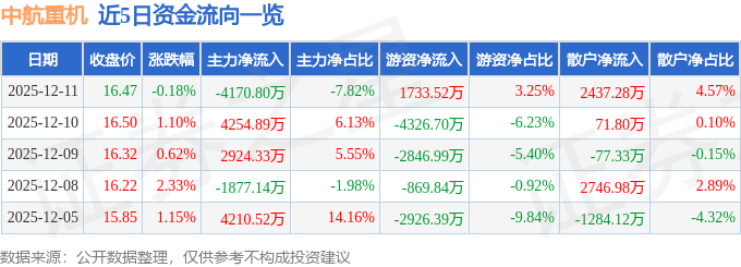 证券之星消息,截至2025年12月11日收盘,中航重机(600765)报收于16.47元,下跌0.18%,换手率2.07%,成交量32.2万手,成交额5.33亿元。