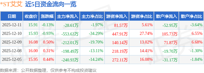 证券之星消息,截至2025年12月11日收盘,*ST艾艾(603580)报收于15.91元,下跌0.13%,换手率0.7%,成交量9176.0手,成交额1453.8万元。