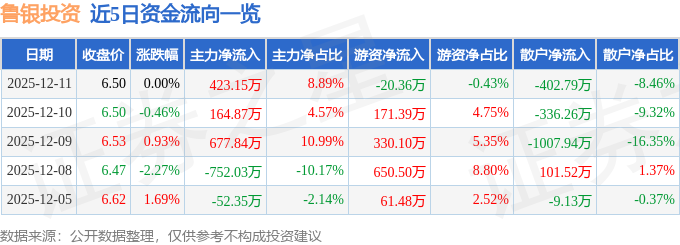 证券之星消息,截至2025年12月11日收盘,鲁银投资(600784)报收于6.5元,上涨0.0%,换手率1.08%,成交量7.33万手,成交额4761.95万元。