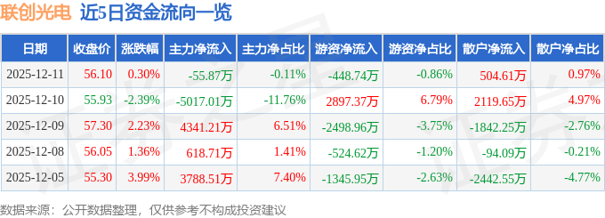 证券之星消息,截至2025年12月11日收盘,联创光电(600363)报收于56.1元,上涨0.3%,换手率2.02%,成交量9.13万手,成交额5.21亿元。