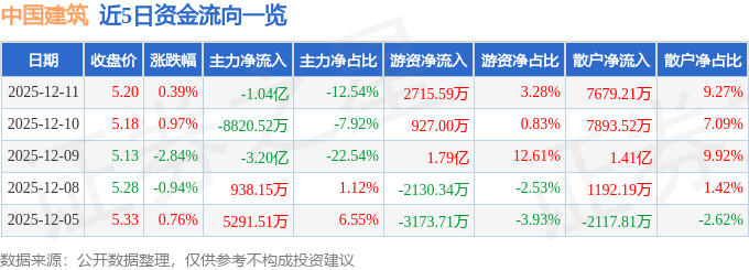 证券之星消息,截至2025年12月11日收盘,中国建筑(601668)报收于5.2元,上涨0.39%,换手率0.39%,成交量159.83万手,成交额8.29亿元。