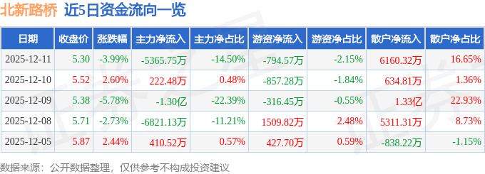 证券之星消息,截至2025年12月11日收盘,北新路桥(002307)报收于5.3元,下跌3.99%,换手率5.44%,成交量68.95万手,成交额3.7亿元。