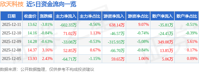 12月11日的资金流向数据方面,主力资金净流出602.33万元,占总成交额8.56%,游资资金净流入638.14万元,占总成交额9.07%,散户资金净流出35.81万元,占总成交额0.51%。