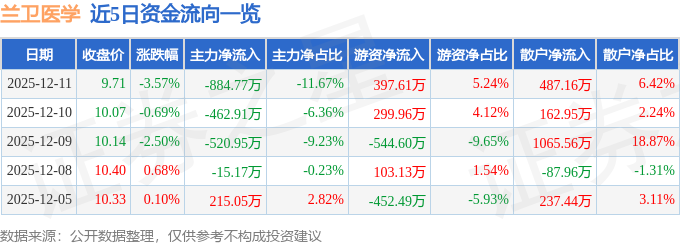 12月11日的资金流向数据方面,主力资金净流出884.77万元,占总成交额11.67%,游资资金净流入397.61万元,占总成交额5.24%,散户资金净流入487.16万元,占总成交额6.42%。