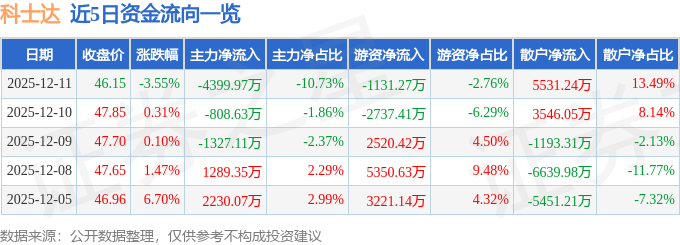 证券之星消息,截至2025年12月11日收盘,科士达(002518)报收于46.15元,下跌3.55%,换手率1.55%,成交量8.74万手,成交额4.1亿元。