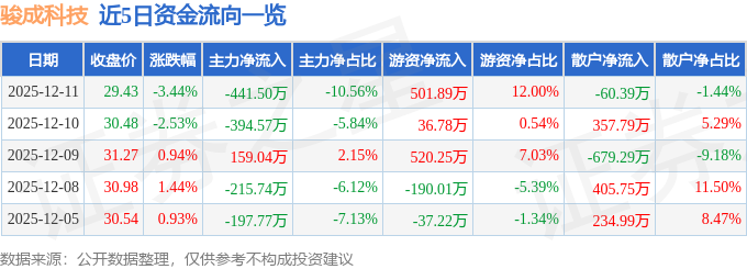 证券之星消息,截至2025年12月11日收盘,骏成科技(301106)报收于29.43元,下跌3.44%,换手率1.37%,成交量1.4万手,成交额4181.21万元。
