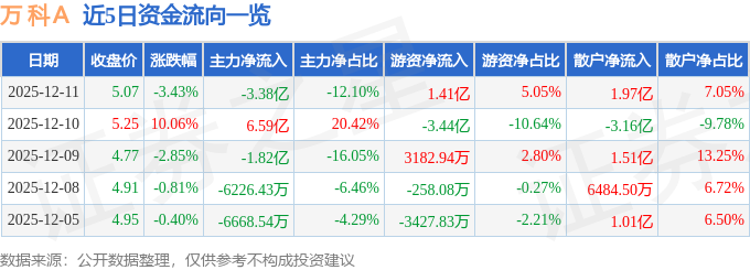 证券之星消息,截至2025年12月11日收盘,万 科A(000002)报收于5.07元,下跌3.43%,换手率5.62%,成交量546.17万手,成交额27.92亿元。