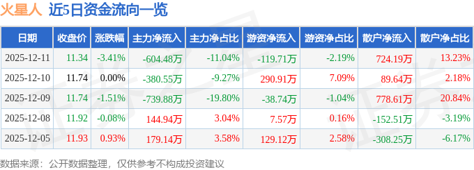 12月11日的资金流向数据方面,主力资金净流出604.48万元,占总成交额11.04%,游资资金净流出119.71万元,占总成交额2.19%,散户资金净流入724.19万元,占总成交额13.23%。
