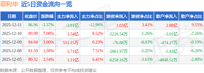 12月11日的资金流向数据方面,主力资金净流出3.91亿元,占总成交额12.96%,游资资金净流入1.03亿元,占总成交额3.41%,散户资金净流入2.88亿元,占总成交额9.55%。