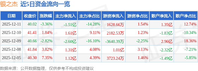 证券之星消息,截至2025年12月11日收盘,银之杰(300085)报收于40.02元,下跌3.36%,换手率3.98%,成交量25.93万手,成交额10.56亿元。