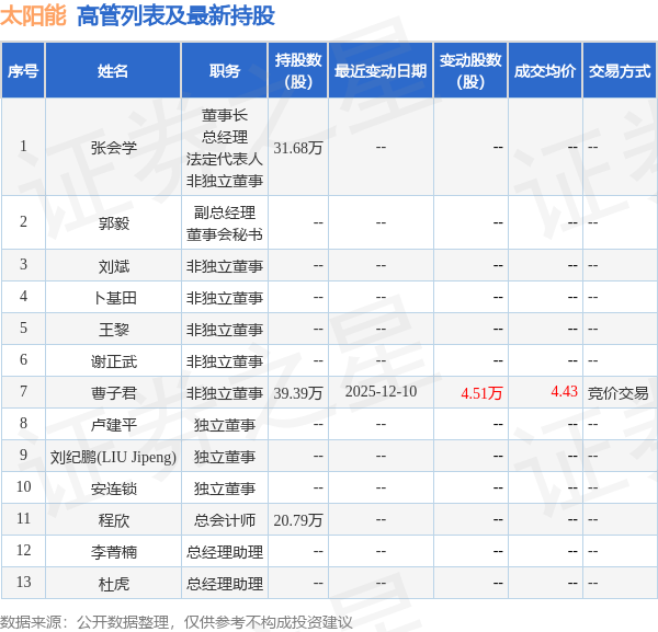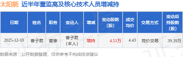 太阳能近半年内的董监高及核心技术人员增减持详情如下: