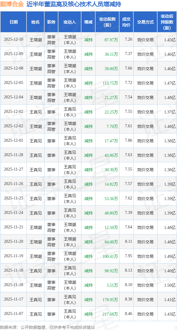 顺博合金近半年内的董监高及核心技术人员增减持详情如下: