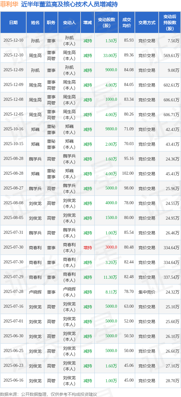 菲利华近半年内的董监高及核心技术人员增减持详情如下: