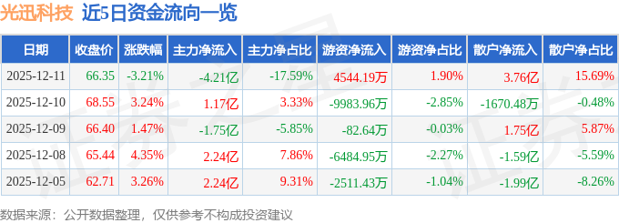 证券之星消息,截至2025年12月11日收盘,光迅科技(002281)报收于66.35元,下跌3.21%,换手率4.57%,成交量35.63万手,成交额23.94亿元。
