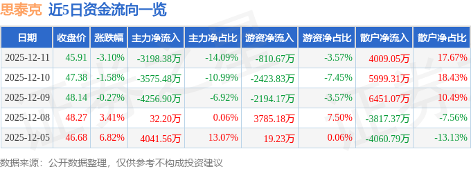 证券之星消息,截至2025年12月11日收盘,思泰克(301568)报收于45.91元,下跌3.1%,换手率10.23%,成交量4.87万手,成交额2.27亿元。