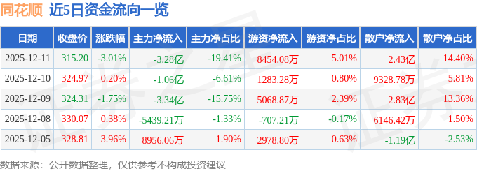 证券之星消息,截至2025年12月11日收盘,同花顺(300033)报收于315.2元,下跌3.01%,换手率1.92%,成交量5.28万手,成交额16.89亿元。