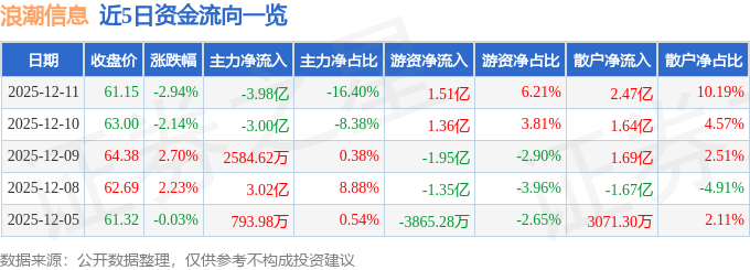 证券之星消息,截至2025年12月11日收盘,浪潮信息(000977)报收于61.15元,下跌2.94%,换手率2.67%,成交量39.22万手,成交额24.26亿元。