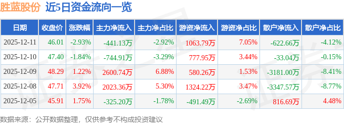 证券之星消息,截至2025年12月11日收盘,胜蓝股份(300843)报收于46.01元,下跌2.93%,换手率2.06%,成交量3.24万手,成交额1.51亿元。