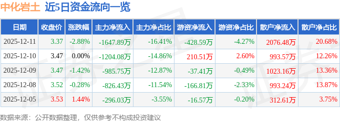 证券之星消息,截至2025年12月11日收盘,中化岩土(002542)报收于3.37元,下跌2.88%,换手率1.68%,成交量29.5万手,成交额1.0亿元。