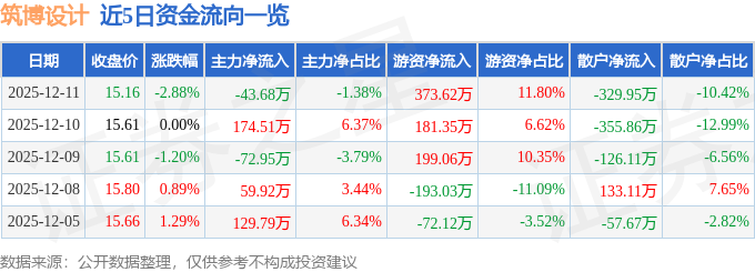 证券之星消息,截至2025年12月11日收盘,筑博设计(300564)报收于15.16元,下跌2.88%,换手率1.82%,成交量2.06万手,成交额3165.75万元。