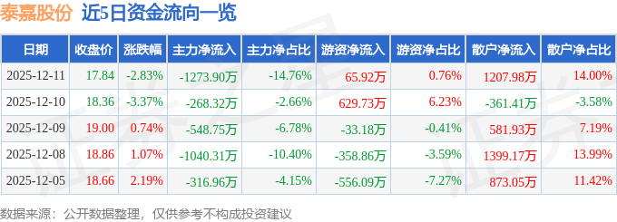 证券之星消息,截至2025年12月11日收盘,泰嘉股份(002843)报收于17.84元,下跌2.83%,换手率1.91%,成交量4.78万手,成交额8630.02万元。