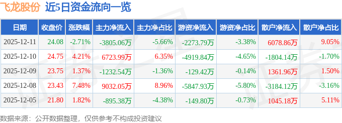 证券之星消息,截至2025年12月11日收盘,飞龙股份(002536)报收于24.08元,下跌2.71%,换手率5.06%,成交量27.56万手,成交额6.72亿元。