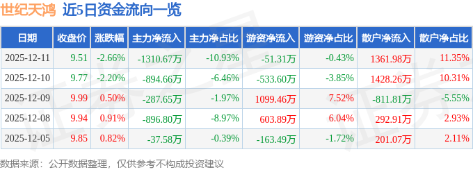 证券之星消息,截至2025年12月11日收盘,世纪天鸿(300654)报收于9.51元,下跌2.66%,换手率3.55%,成交量12.49万手,成交额1.2亿元。
