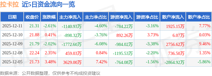 证券之星消息,截至2025年12月11日收盘,拉卡拉(300773)报收于21.31元,下跌2.61%,换手率1.57%,成交量11.5万手,成交额2.48亿元。