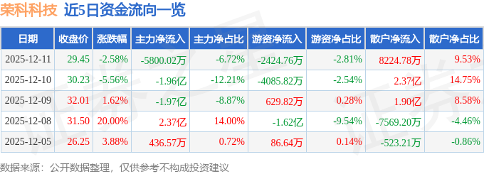 证券之星消息,截至2025年12月11日收盘,荣科科技(300290)报收于29.45元,下跌2.58%,换手率4.52%,成交量28.93万手,成交额8.63亿元。