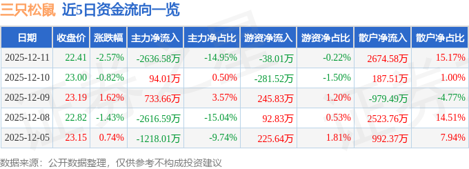 证券之星消息,截至2025年12月11日收盘,三只松鼠(300783)报收于22.41元,下跌2.57%,换手率2.78%,成交量7.8万手,成交额1.76亿元。