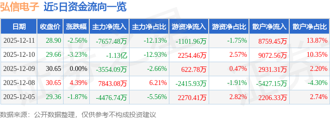 证券之星消息,截至2025年12月11日收盘,弘信电子(300657)报收于28.9元,下跌2.56%,换手率4.58%,成交量21.59万手,成交额6.31亿元。