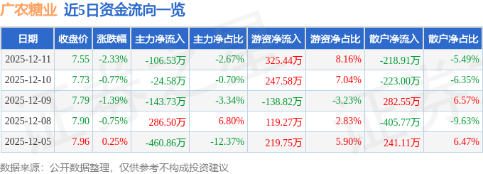 证券之星消息,截至2025年12月11日收盘,广农糖业(000911)报收于7.55元,下跌2.33%,换手率1.31%,成交量5.25万手,成交额3987.58万元。