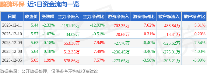 证券之星消息,截至2025年12月11日收盘,鹏鹞环保(300664)报收于5.44元,下跌2.33%,换手率2.23%,成交量16.81万手,成交额9213.81万元。
