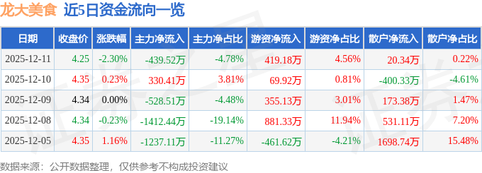 证券之星消息,截至2025年12月11日收盘,龙大美食(002726)报收于4.25元,下跌2.3%,换手率1.99%,成交量21.44万手,成交额9185.49万元。
