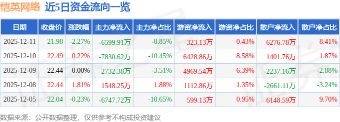 证券之星消息,截至2025年12月11日收盘,恺英网络(002517)报收于21.98元,下跌2.27%,换手率1.79%,成交量33.75万手,成交额7.46亿元。