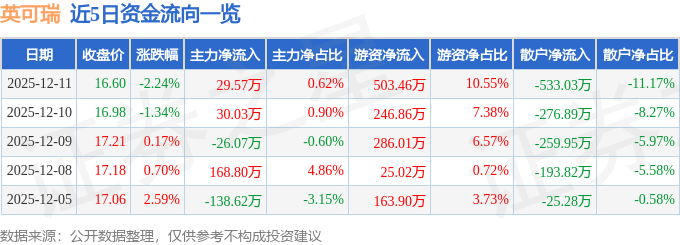 12月11日的资金流向数据方面,主力资金净流入29.57万元,占总成交额0.62%,游资资金净流入503.46万元,占总成交额10.55%,散户资金净流出533.03万元,占总成交额11.17%。
