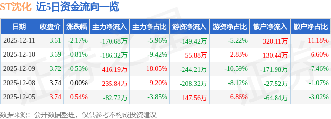 证券之星消息,截至2025年12月11日收盘,ST沈化(000698)报收于3.61元,下跌2.17%,换手率1.0%,成交量7.85万手,成交额2863.16万元。