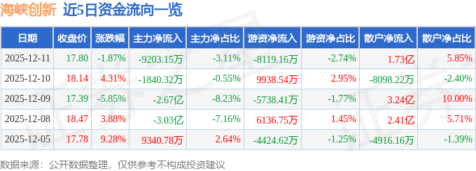 证券之星消息,截至2025年12月11日收盘,海峡创新(300300)报收于17.8元,下跌1.87%,换手率25.09%,成交量167.28万手,成交额29.59亿元。
