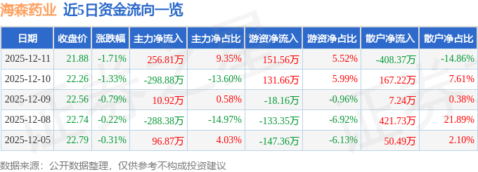 证券之星消息,截至2025年12月11日收盘,海森药业(001367)报收于21.88元,下跌1.71%,换手率3.14%,成交量1.25万手,成交额2747.98万元。