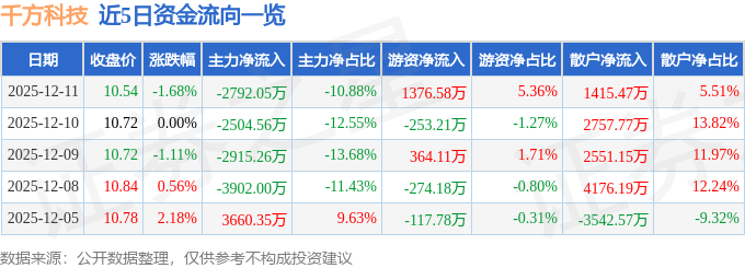 12月11日的资金流向数据方面,主力资金净流出2792.05万元,占总成交额10.88%,游资资金净流入1376.58万元,占总成交额5.36%,散户资金净流入1415.47万元,占总成交额5.51%。