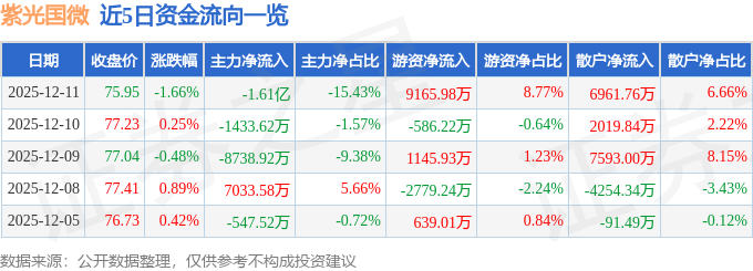 证券之星消息,截至2025年12月11日收盘,紫光国微(002049)报收于75.95元,下跌1.66%,换手率1.6%,成交量13.63万手,成交额10.45亿元。