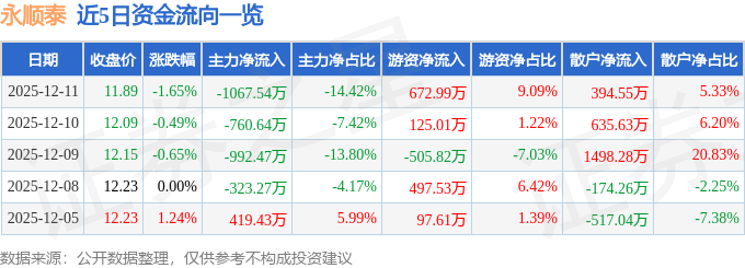 证券之星消息,截至2025年12月11日收盘,永顺泰(001338)报收于11.89元,下跌1.65%,换手率1.23%,成交量6.19万手,成交额7401.79万元。
