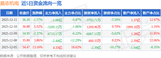 证券之星消息,截至2025年12月11日收盘,昊志机电(300503)报收于36.3元,下跌1.57%,换手率11.97%,成交量28.84万手,成交额10.58亿元。